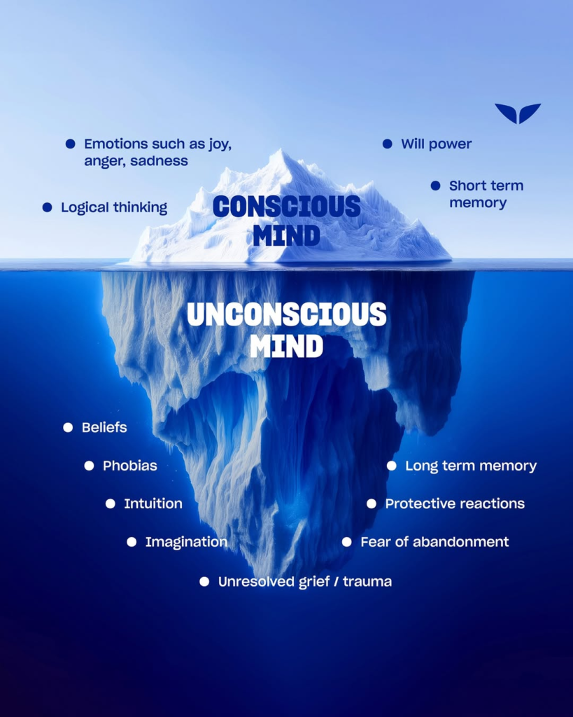 We can view the leader’s mind as an iceberg. The Conscious Mind holds our logical thinking and willpower—skills that AI is beginning to encroach upon. But below the waterline lies the Unconscious Mind. This is the reservoir of our beliefs, intuition, imagination, and even our protective reactions.
